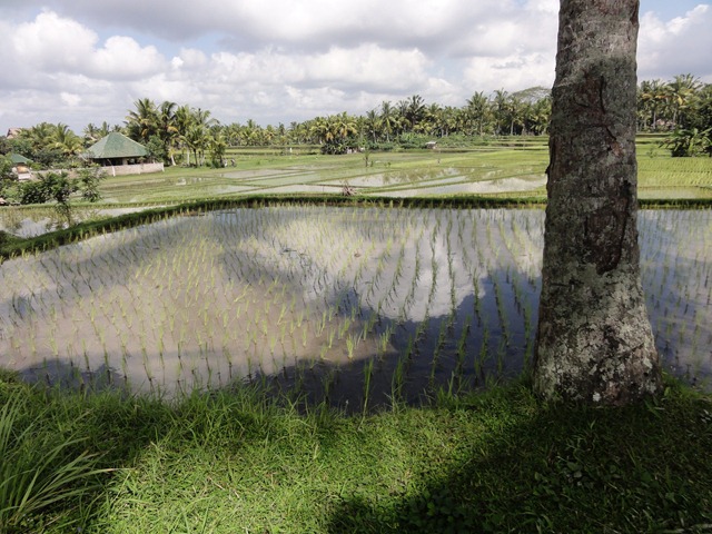 Outside of the cities in Java, you can see the ever present rice fields at different stages of their life cycles. First, rice grains are sown tightly in a field nursery. The slender new plants form bright green patches in the field, surrounded by water that reflects the sky. These are replanted in rows in a flooded field. As they mature, they change into different shades of green before rice stalks appear. These too start as green and then turn golden yellow. To mature properly, the flooded field must be drained or the rice grain won’t fill. Rain is not wanted during this time.