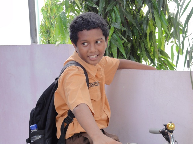 We left the alley and we noticed a little boy was following us on his bicycle. He stopped when we stopped, usually when Jim was taking pictures. Jim smiled and waved at him and held up his camera to ask if he could take his picture. The boy, dressed in a brown school uniform, smiled and nodded. I read the name tag sewn above his shirt pocket –Ignatius R.R. “Ignatius, are you Kristen?” I ask. “Katolik,” he answers. In Indonesia, Kristen usually means Protestant.