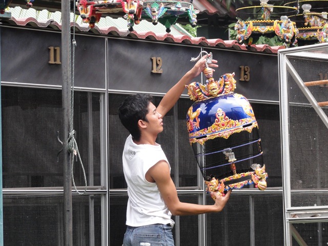 He bred and competed for 11 years and then came the avian flu outbreak. Perkutut were not affected but fears about any birds made the market collapse just after Henry made a huge investment. Two years ago he got back in, going to every contest to rebuild his standing. His new strategy seeks out offspring of champions which can be gotten cheaper than the champions themselves. He nurtures the voice with sweet saga leaves commonly used in human cough medicine. Normally the monogamous dove shares egg sitting time and males anger if eggs are removed. Henry treats the testy boys with a light dose of de-worming medicine which induces fatigue.